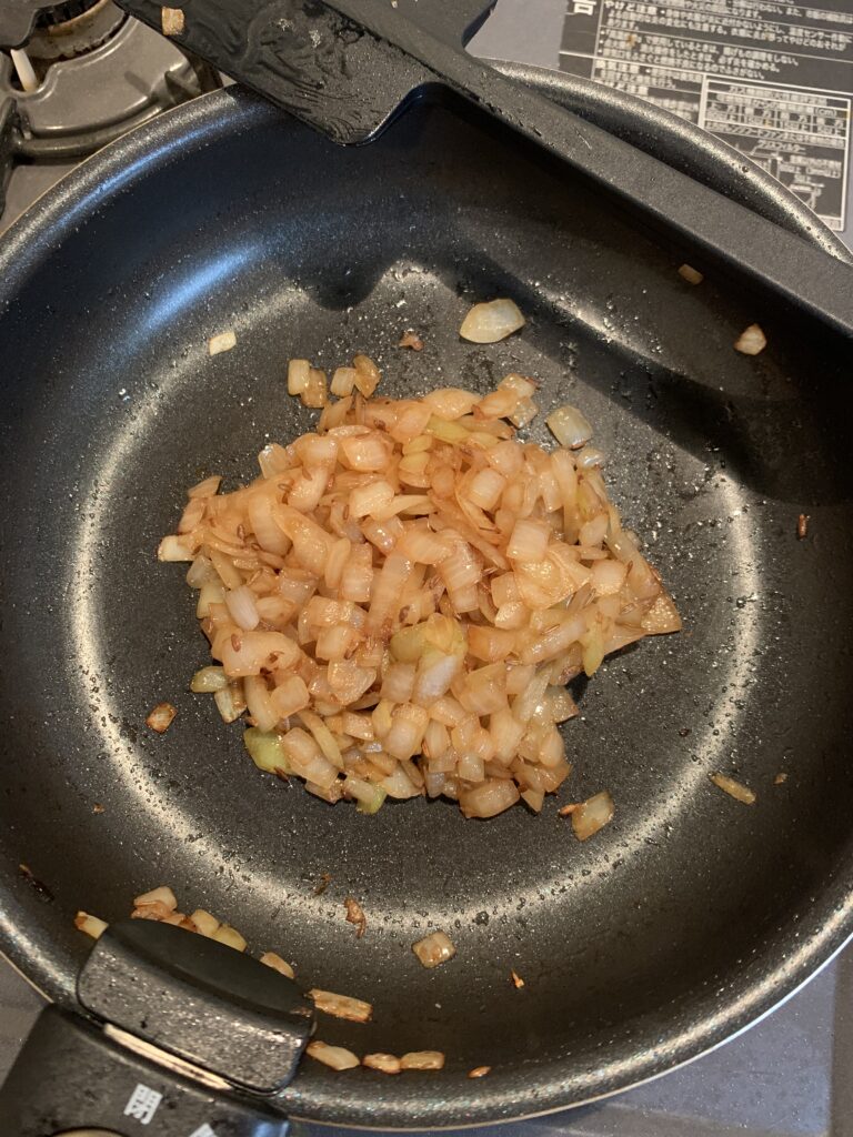 玉ねぎの切り方は粗みじん切りに統一し、炒め時間による違いを検証します。